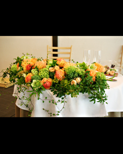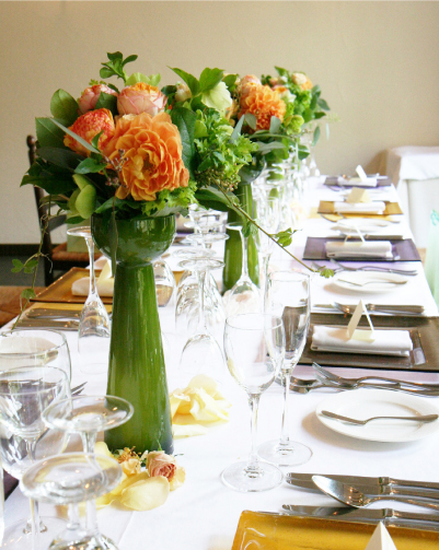 会場装花はもちろん、フラワーアクセ、ウェルカムボードやリングピローなど、何でもお任せください。会場の広さやテーブルのレイアウト、サイズなどがわかるものをお持ちください。
